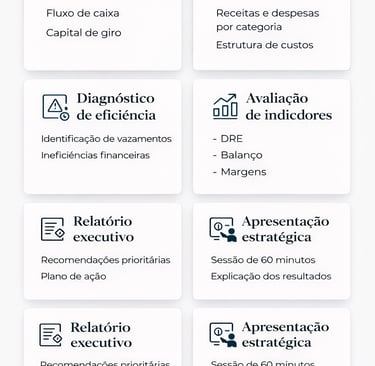 Assessoria contínua para estruturar, otimizar e direcionar a gestão financeira da empresa, com foco em organização financeira, tomada de decisão estratégica e crescimento sustentável.