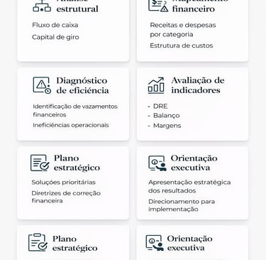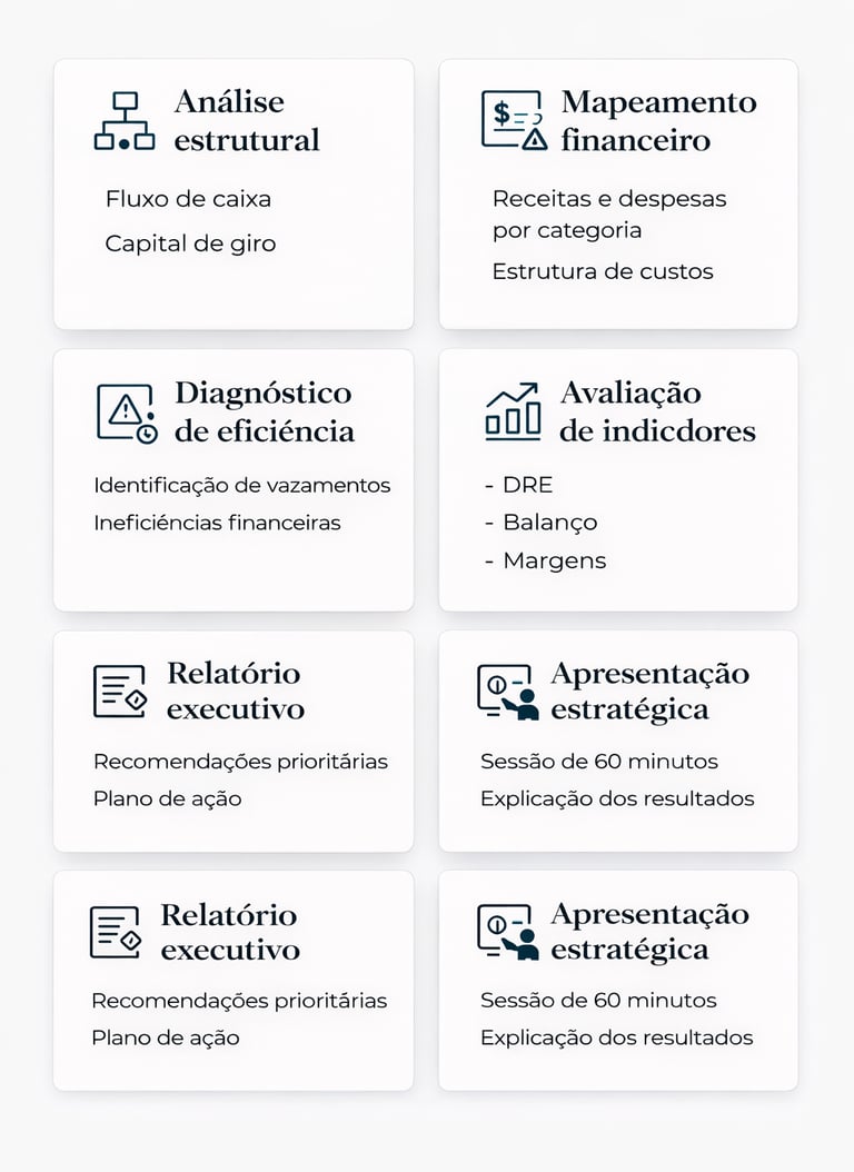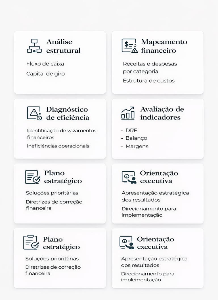 Análise estratégica da estrutura financeira da empresa para identificar ineficiências, vazamentos de recursos e apresentar soluções claras de melhoria.